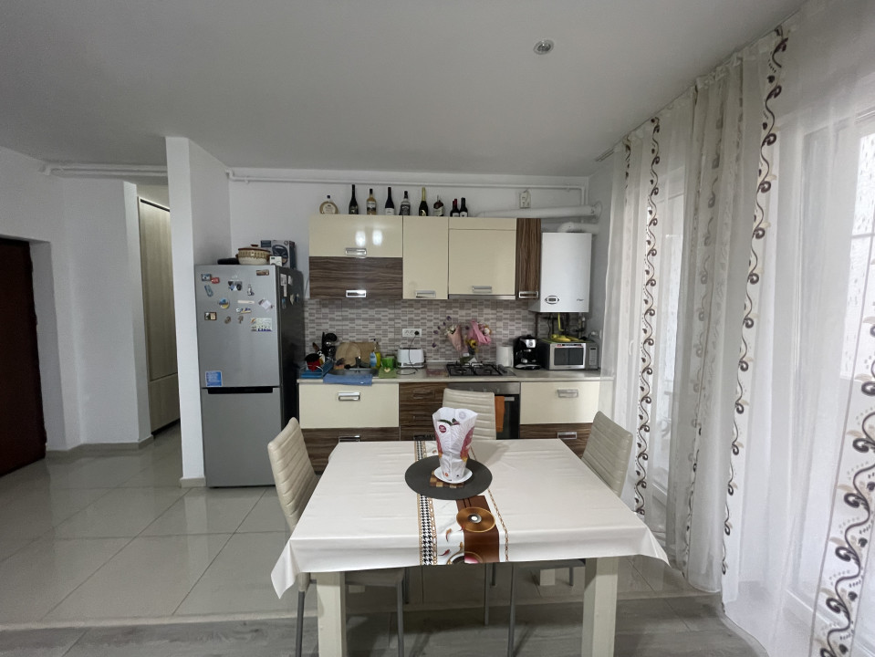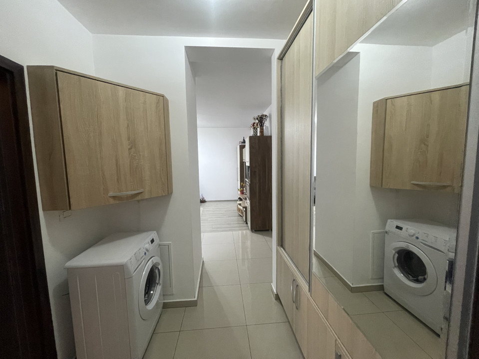 Bucatarie deschisa utilata: Frigider, hota, cuptor electric, plita pe gaz, masina de spalat rufe.