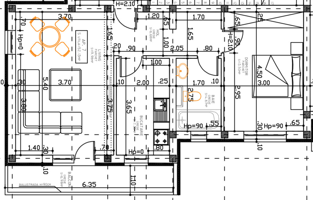 Apartamentele cu 3 camere dispun de urmatoarea compartimentare: living generos cu bucataria open space si acces la balcon, 2 bai, 2 dormitoare cu acces in balcon.