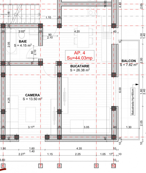 Apartamentele dispun de urmatoarea compartimentare: hol acces, living cu bucataria open space si acces in balcon (8 mp), baie cu cada sau dus, dormitor.