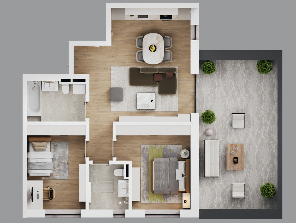 Alege dintre apartamente cu 1, 2 sau 3 camere, gândite cu atenție pentru a oferi spații aerisite, compartimentări inteligente și finisaje de calitate superioară, ce îmbină designul contemporan cu funcționalitatea.
