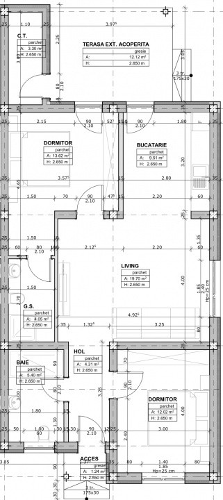 Compartimentare: hol de acces, living generos, bucatarie open-space cu iesire pe o terasa acoperita, dormitor matrimonial cu baie proprie, dormitor, baie, spatiu pentru depozitare, acces in pod.