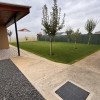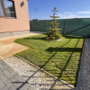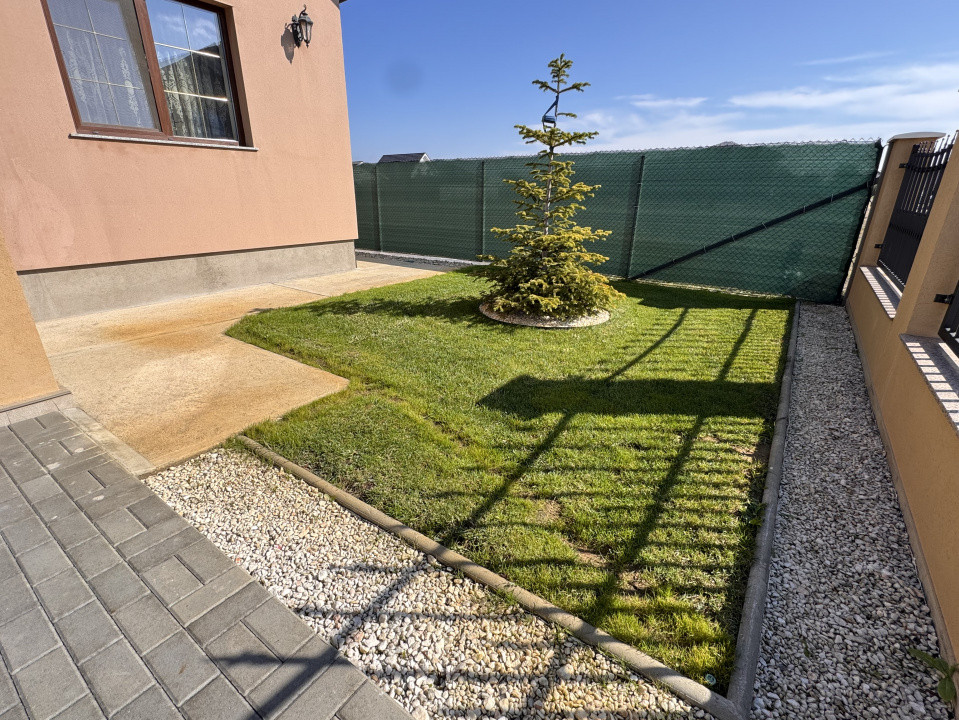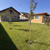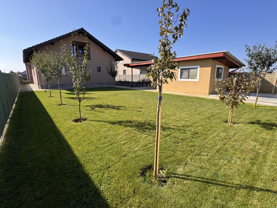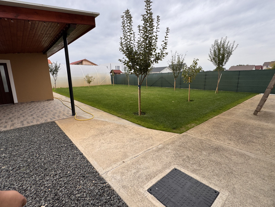 Curtea este complet amenajată, cu gazon și copaci ornamentali