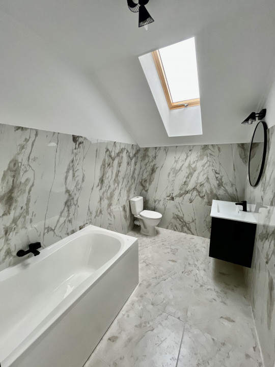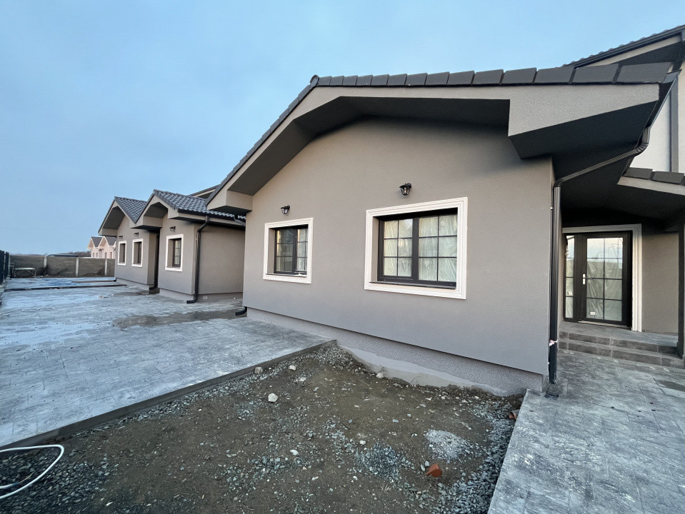 Dotari imobil: centrala termica in condensatie, incalzire in pardoseala, termostate ambientale, tamplarie PVC tripan, rulouri exterioare, glafuri exterioare din marmura, pod izolat cu spuma, izolatie exterioara cu polistiren de 15 cm, zidarie din caramida, parchet SPC.