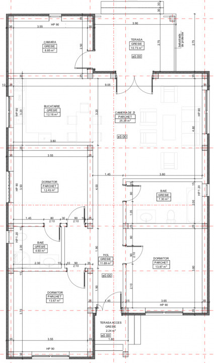 Compartimentare: hol de acces, living generos cu iesire pe o terasa acoperita, bucatarie open-space, dormitor matrimonial cu baie proprie, 2 dormitoare, baie, camera terhnica, acces in pod.