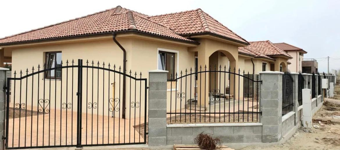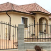 Teren împrejmuit cu gard din placi de beton pe lateral iar in fata casei gard boltari de ciment,poarta acces auto și poarta fier forjat.