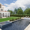Curte amenajată cu gazon și sistem de irigare